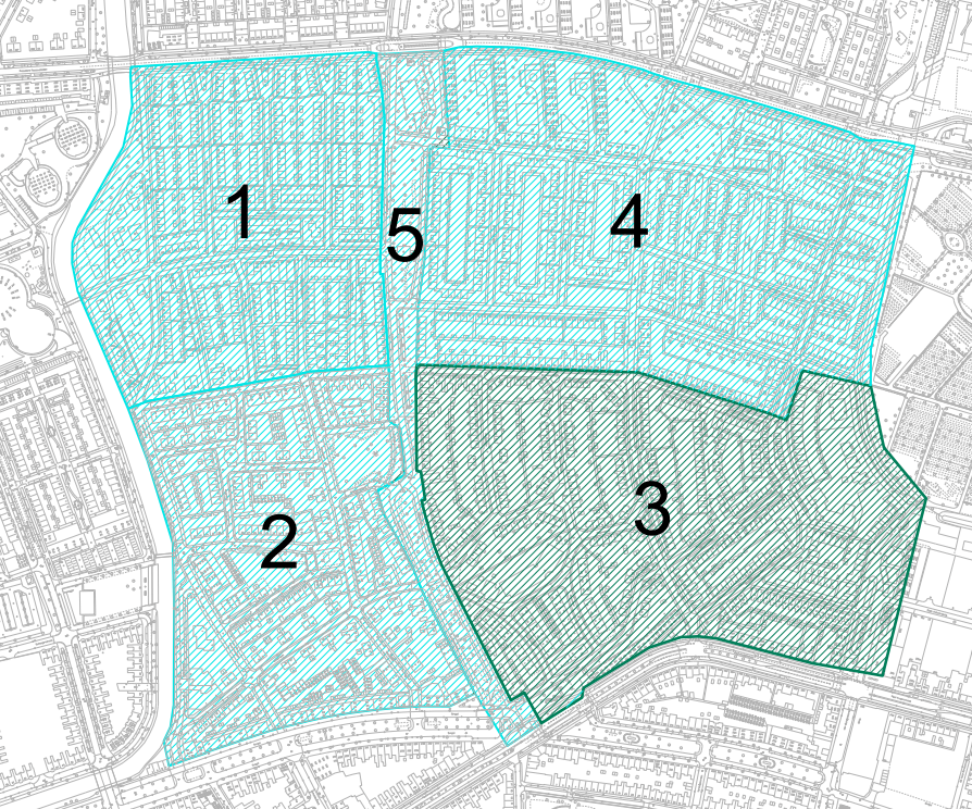 De wijk is voor de herinrichting opgesplitst in 5 deelgebieden, zoals op onderstaande kaart staat aangegeven.